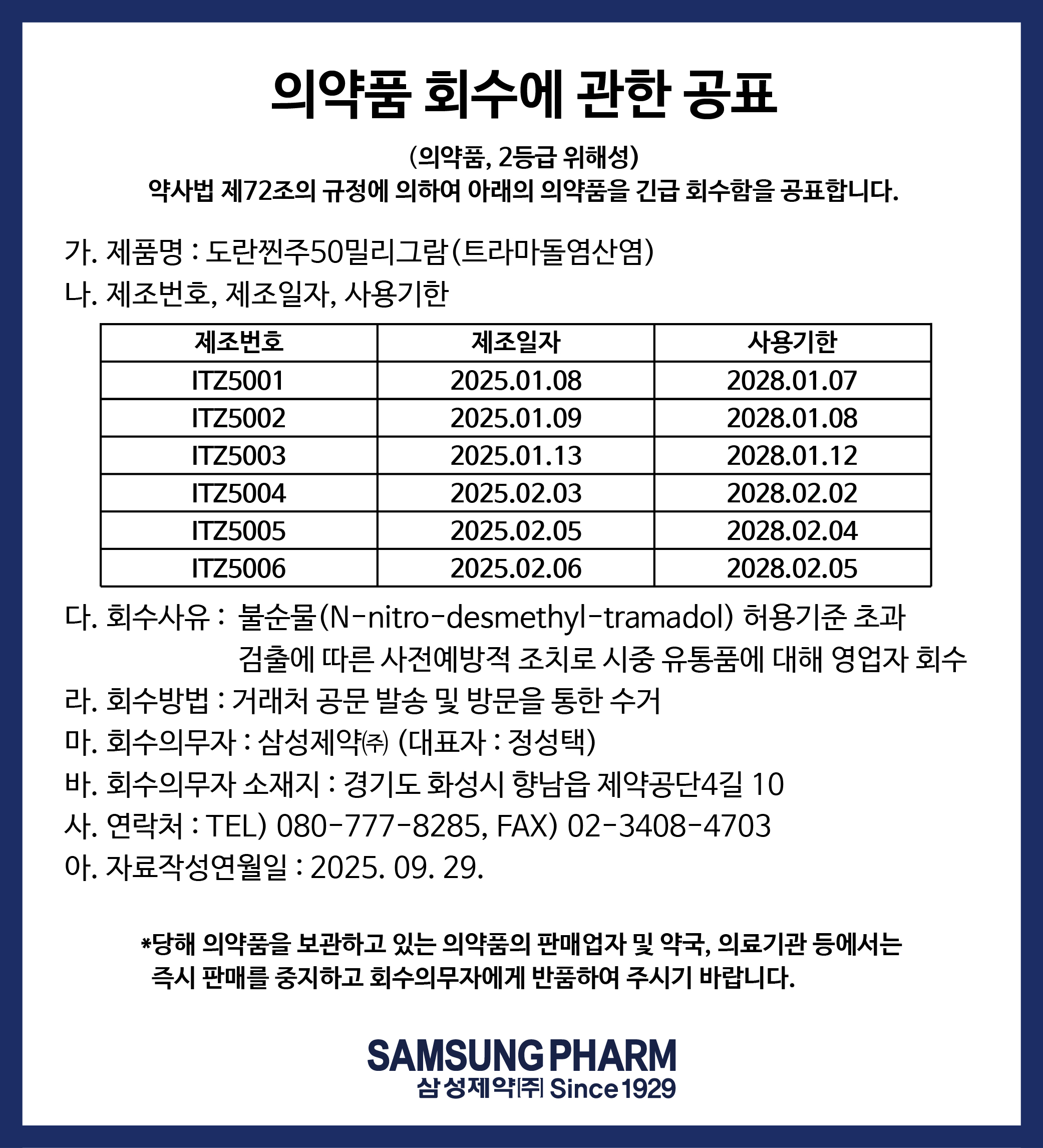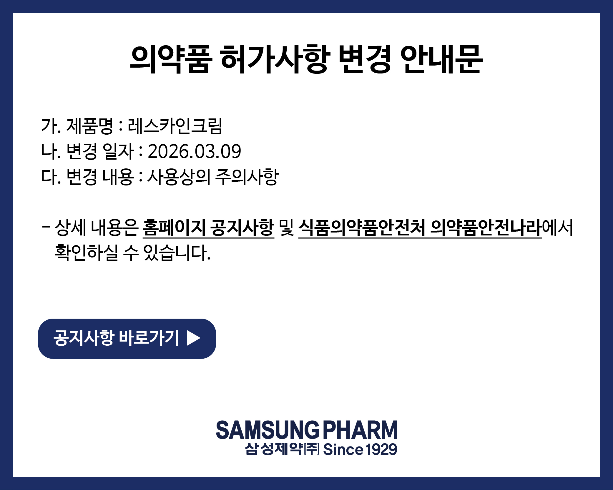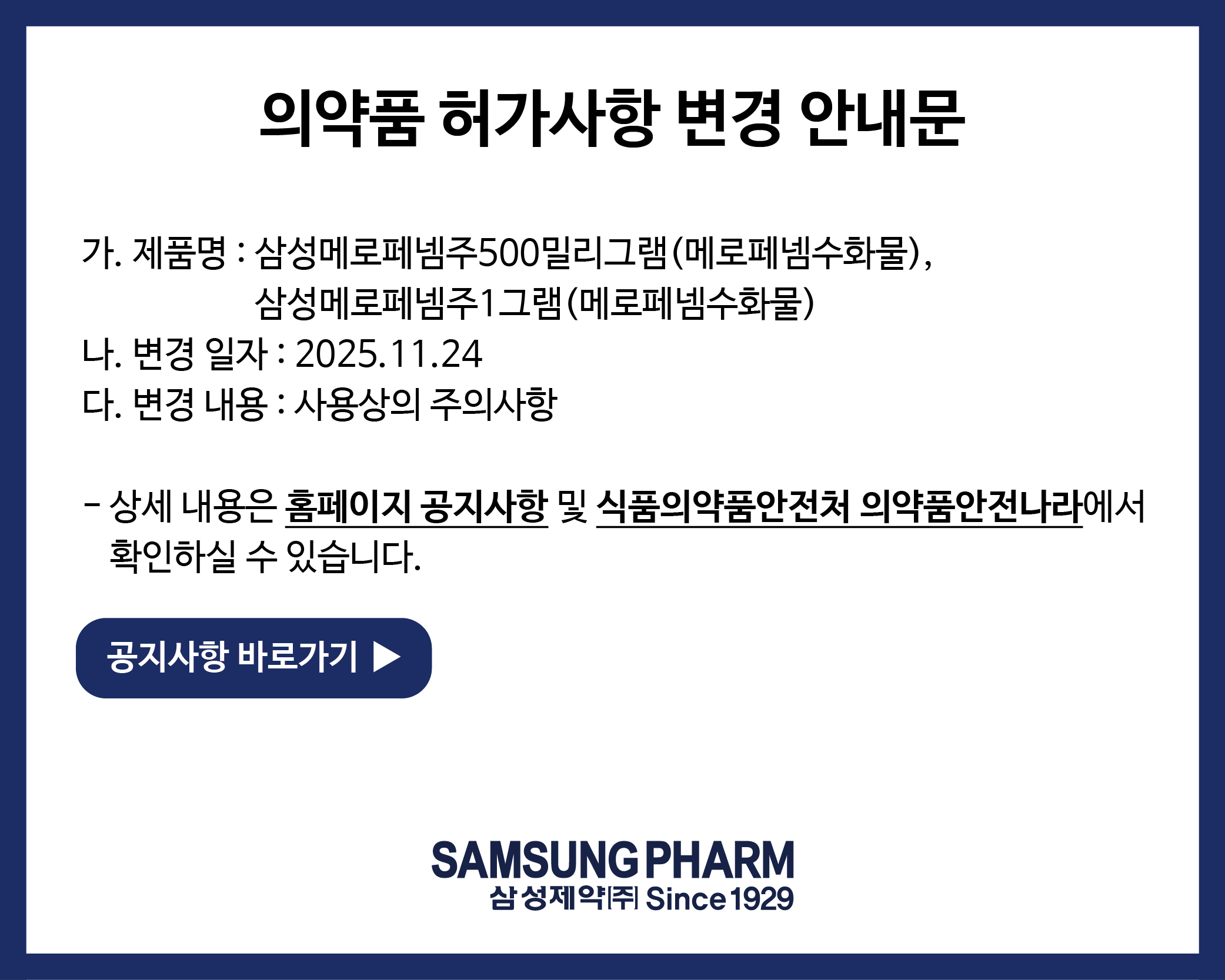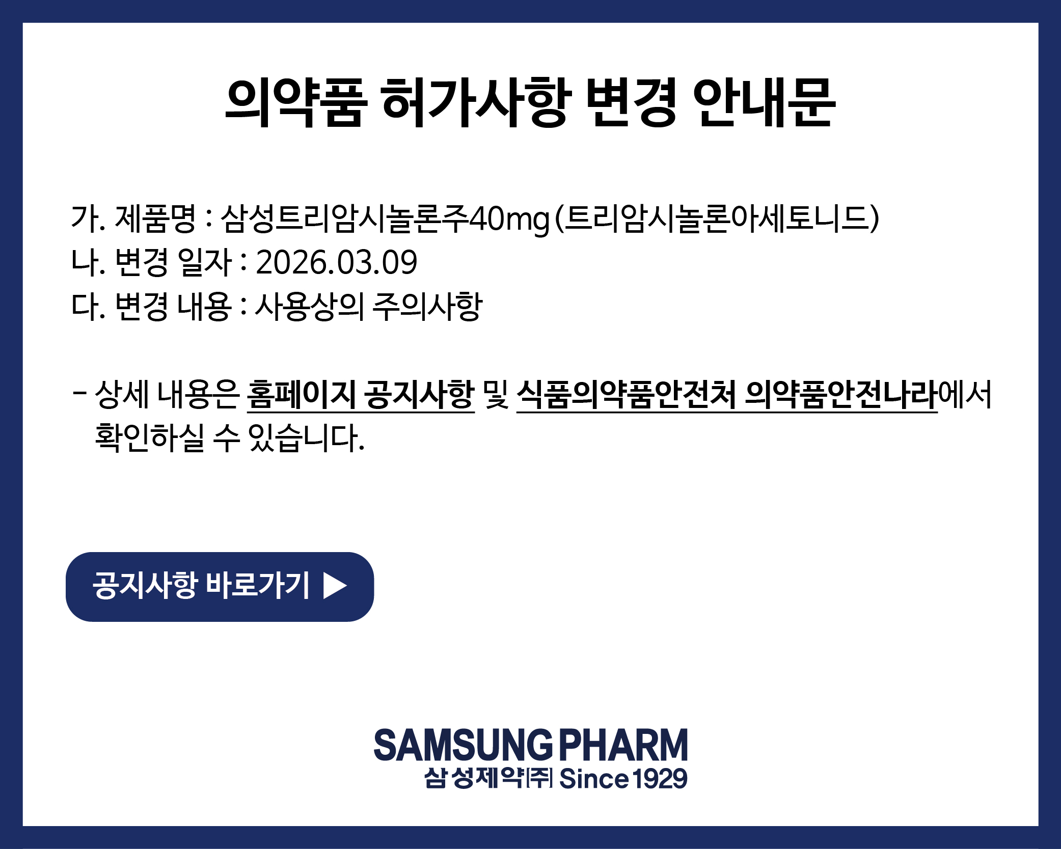 삼성제약(주) 의약품 공지사항을 안내드립니다.