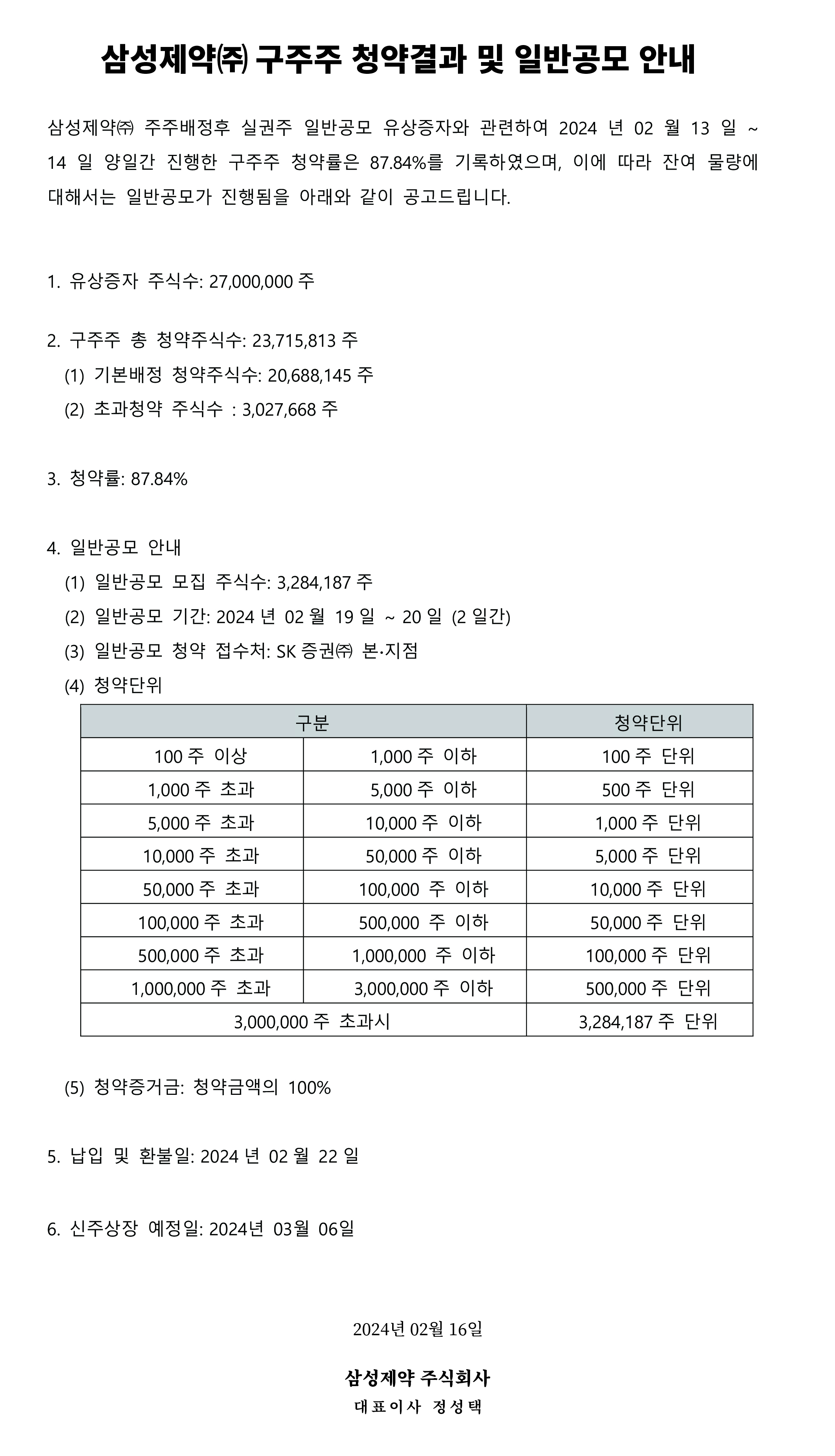삼성제약㈜ 구주주 청약결과 및 일반공모 안내